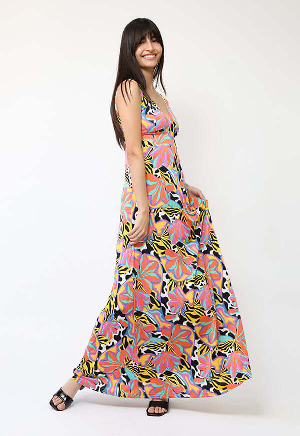 Vestido Vera Flores Naranjas Turquesa Amarillo – Vestido de Diseño Chileno
