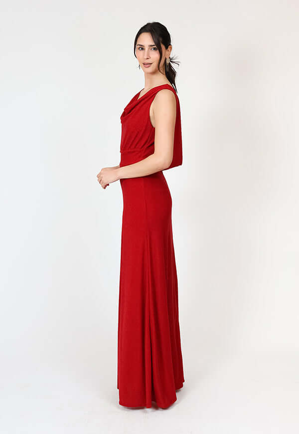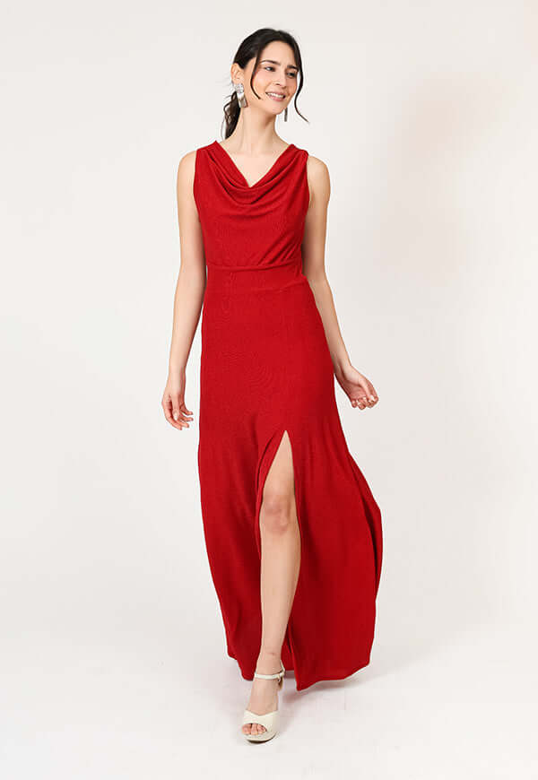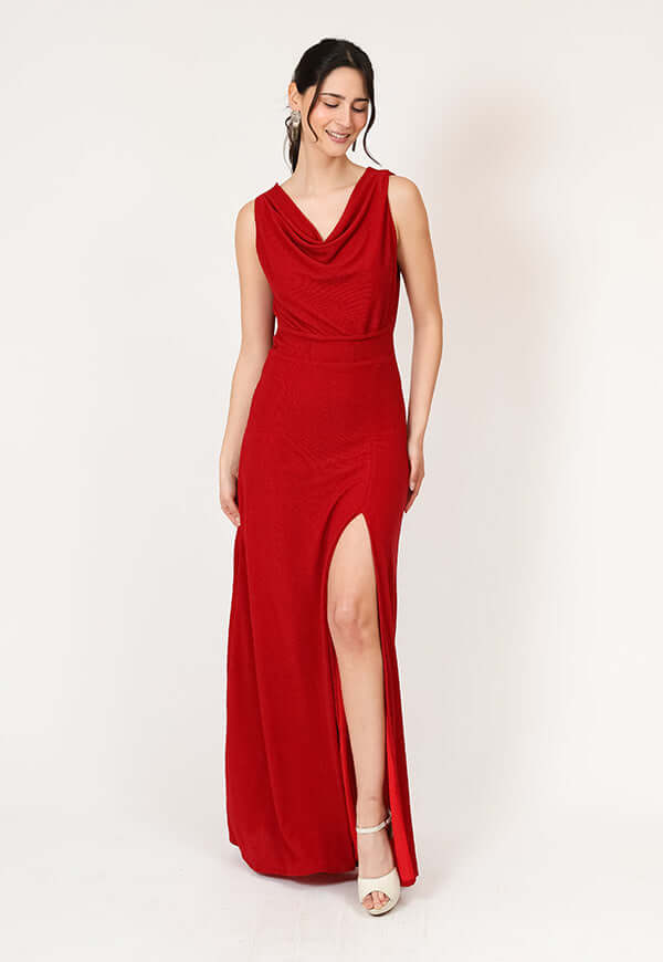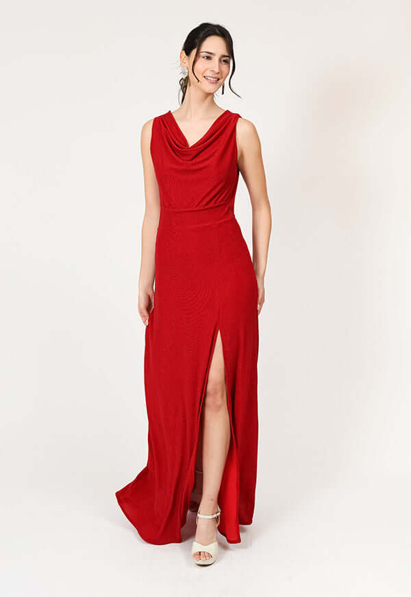 Vestido Drapeado Tajo Rojo Brillo Fiesta – Vestido de Diseño Chileno