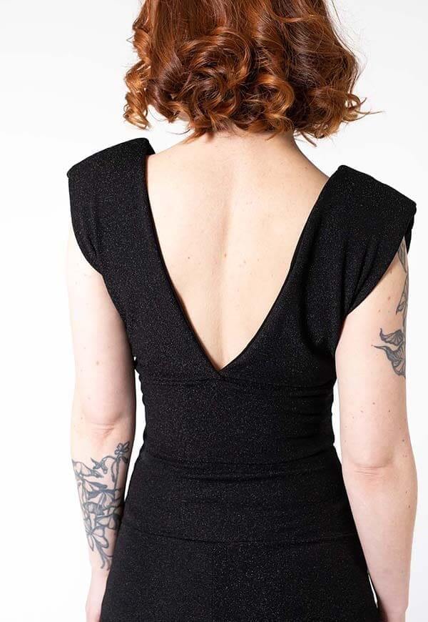 Crop Top Camile Fiesta Negro Brillos Natalia Seguel lentejuelas, espalda – diseño chileno de autor, Natalia Seguel