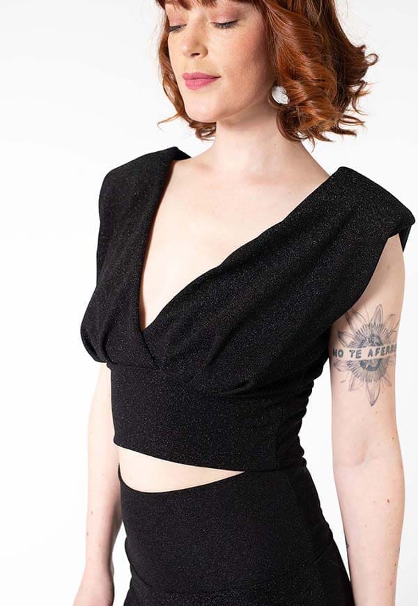 Crop Top Camile Fiesta Negro Brillos Natalia Seguel lentejuelas, detalle de tela – diseño chileno de autor, Natalia Seguel