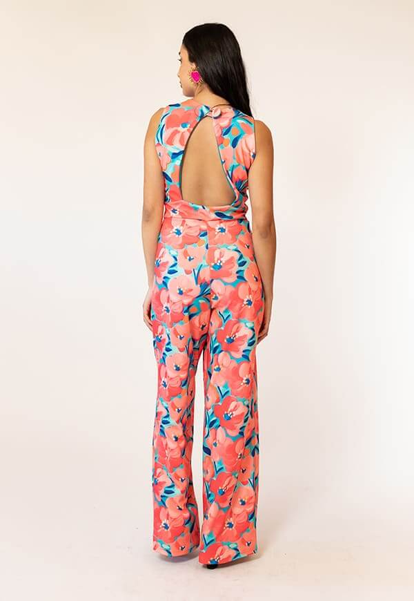 Enterito Cata Turquesa Flores Coral Natalia Seguel estampado flores, espalda – diseño chileno de autor, Natalia Seguel